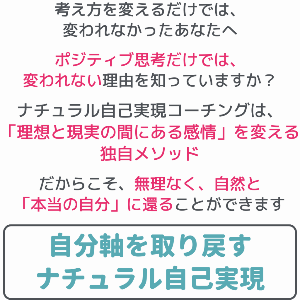 ナチュラル自己実現コーチングでは、「理想の自分」と「現在の自分」の間にある感情を変換する独自メソッド を活用し、